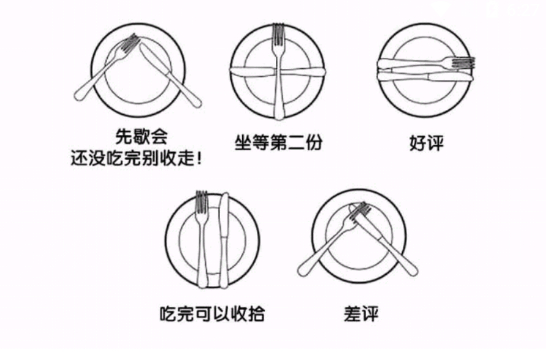 在西餐厅,可以通过刀叉的摆放形状来跟服务员交流,比…